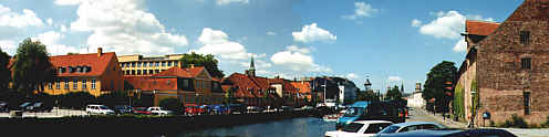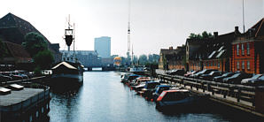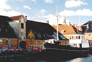 Det stora lagerhuset till höger är Christian 4.s pakhus ( Christian 4.s. Bryghus) från 1600-talet. Fyrskeppet, Fyrskib XI, vid kajen är byggt 1878 och tillsammans med Fyrskib XII, Danmarks äldsta.
