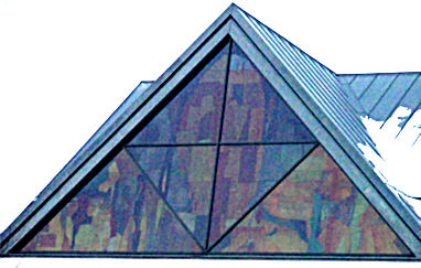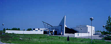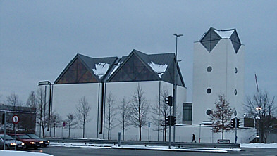 | Vejleå Kirke ligger några hundra meter norr om Ishøjs centrum. Den invigdes 1997. De stora trekantiga fönstren är smyckade med färggranna glasmosaiker. | ||