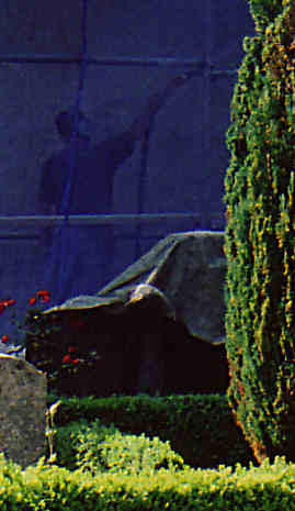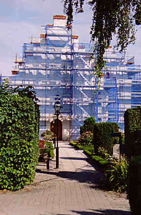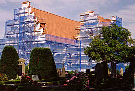 När jag kom till Skanörs vackra kyrka, var den alldeles blåskimrande. Den var täckt av något plått säckväv för att skydda omgivningen mot damm och färg under ett renoveringsarbete.