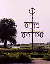 Längst till vänster: Man har försökt att återskapa en majstång från 1700-talet som Linnè såg vid sitt besök. Inte helt likt om man jämför med bilden från 1749. |