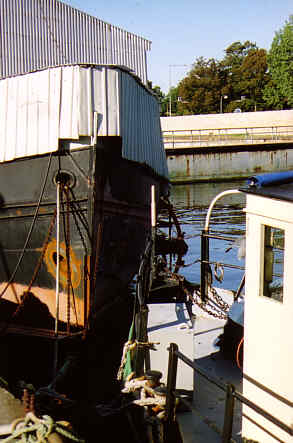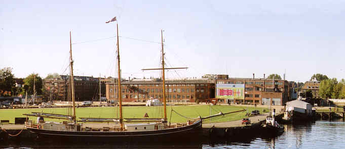 | Ovan: En gammal svängkran. Nedan en tremastad skonare vid det fd. varvsområdet. |