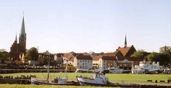 | Ovan: Vy från det fd. varvsområdet: Till vänster: Sct. Olai Kirke. Till höger: Sct. Mariæ Kirke. |