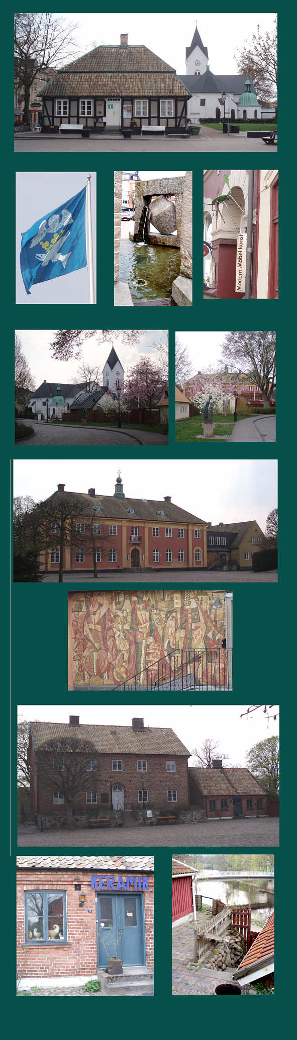 | Då Rynestad (även känt som Luntertun) tvingades flytta uppströms Rönne å, skapades Ängelholm. Äldsta kända omnämnandet av Ängelholm är från 1516. Kyrkan byggdes samma år. Som alla andra skånska städer drabbades även Ängelholm av de svenska trupperna under 30-åriga kriget (1600-talet). På 1700-talet brann staden ner. Sandflykt har varit ett problem för boende längs sandsttränder och redan på 1700-talet planterades strandhavre och skog för att skydda staden från flygsanden. Det gamla rådhuset, överst är från 1770-talet och är idag turistbyra. Det vackra röda huset med taktornet är det gamla tingshuset, idag friskola. Hantverksmuseet finns också på Tingstorget, inrymt i ett gammalt häkte. Här kan man också se vad som äldre generationer tyckte var typiskt för staden: Lergöken, som med sin vridna bakdel knappast ser ut som en gök, men däremot går att spela på. |