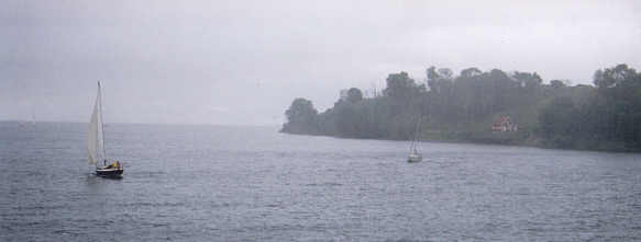 Hven möter med en kraftig regnskur. Nedan: Hamnen i Bäckviken.