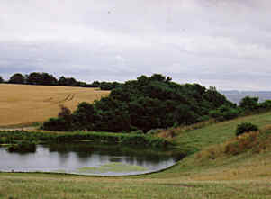 Till höger: En av de rekonstruerade dammarna till Tych Brahes papperskvarn. Dammarna skulle ge fallhöjd åt vattnet som drec hjulen till kvarnen som låg nere vid stranden bakom träddungen.