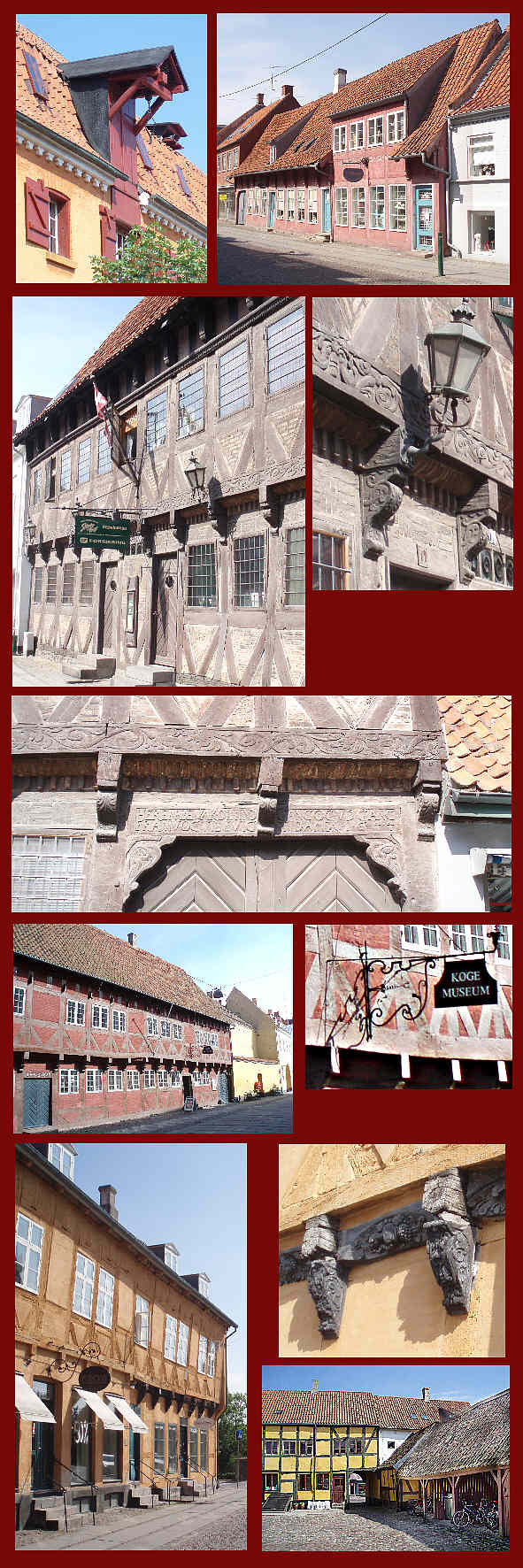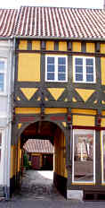 Det ockrafärgade huset (och detaljbild) visar Brogade 23 som genomgått många ombyggnader sedan det byggdes under förra hälften av 1600-talet. Den sista bilden ovan är gården på Brogade 16 (uppfört1636). Bilden nedan är en del av gathuset.