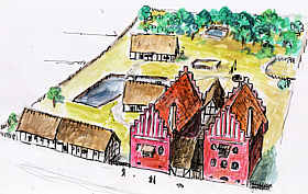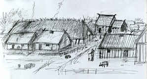 MaktcentrumNär Sven Tveskägg i slutet av 900-talet lät anlägga Lund, var Danmark ännu ett löst sammanhängande rike med starka lokala hövdingar. Med Lund ville han stärka den kungliga makten över Skåne. Tidigt anlades ett myntverk och en kungsgård för att ytterligare befästa den kungliga makten. Hantverkare av alla slag och köpmän (som i allmänhet också var bönder) slog sig ner i Lund. Till husen hörde även stallbyggnader för kreatur och hästar. Man höll sig med höns och de små svinen bökade på stadens gator. Mer eller mindre förvilödade hundar nafsade i häst och andra djurkadaver som låg och ruttnade på gatorna. Alla kadaver, avföring från de många djuren och från mänskor, utkastat skräp och andra lämningar, gjorde att gatorna och gränderna ofta var svåra att ta sig fram på. Denna bondby-prägel skulle staden ha ända in på 1800-talet. På morgnarna drev borgarna sina kreatur genom staden ut på betesmarkerna utanför staden och på kvällarna drevs de in i staden för att stå i stall över natten. Marken var sank, något som man vid Stortorget försökte åtgärda med den tidens vägbeläggning: Träbryggor som täckte hela torgets yta, senare kullersten. Små bäckar rann i genom staden och här och var fanns små dammar. HusenDen första husen var gjorda av lera som klinats på vidjor inflätade mellan stolpar. De var korsvirkeshusens föregångare och liknande hustyper har funnits sedan stenåldern. De äldsta husen var av långhus-typ, men vid 1000-talets början krympte de till 6-8 meters längd. Vid århundradets slut ersattes de av resvirkeshus vars stolpar först stod direkt i marken, men för att minska förruttnelse placerades timret senare på syllar. Från 1200-talets slut till 1800-talet kom korsvirkeshusen att dominera. De flesta var låga envåningshus med halmtak. Kravet på bättre brandskydd ledde till att husen fick tegeltak i slutet av 1700-talet. På 1100-talet ersattes stavkyrkorna med stenkyrkor. ![]() Till vänster: Långhus från vikikingatidens slut och två hus med lerklinade väggar. Till höger; Resvirkeshus. I bakgrunden syns en stavkyrka.