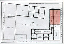 Tegnèrs hus. Ovan: Det lilla gula huset är allt som återstår av den fastighet som sedermera Växiö-biskopen Esaias Tegnèr bodde i på 1820-talet. Hans hemska pekorala dikter hänförde äldre generationer. Ännu så sent som på 1960-talet tvingades vi som gick i skolan lära oss hans dikter utantill: "Sitter i högen högättad hövding / slagsvärd vid sida och skölden på arm..." etc. Hans storhet är dock numera omtvistad. Huset är ett putsat korsvirkeshus från 1768 och idag museum. Det vita huset till höger är från 1845, men dess valvformiga fönster blev till 1906. Nedan: Planritning över Tegnèrs hus. Det röda markerar allt som finns kvar idag.