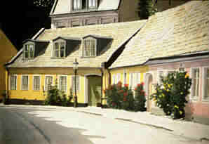 Ovan och nedan: Det gul och röda huset är Adelgatan 7, ett korsvirkeshus på tegel (vanlig form av korsvirke i Lund) är i sina äldsta delar från 1823. Det helt gula huset nedan till vänster är Adelgatan 5 från 1844. Målningar av Erik Lundgren.