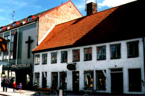 Pingstkyrkan till vänster är från 1966 och det putsade korsvirkeshuset