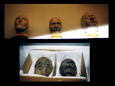 Döden: Dödsmasker av professorer och mumiehuvuden. Death: Death masks of professors and mummies.