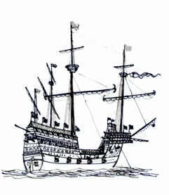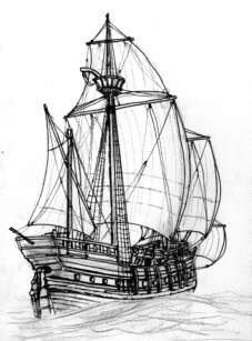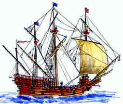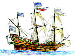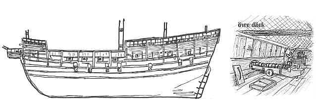 FEMTONHUNDRATALETS SKEPP Bilden ovan visar en typisk karrack från början av 1500-talet: Det höga akterkastellet och den ännu högre backen, äntringsnäten över däcken, de fyra masterna, krokarna (eller knivarna) på storråns och fockråns nockar (som användes för att riva sönder fiendens rigg), äntringsdraggen under bogsprötsnocken, och de många små kanonerna (varav flera pekar in mot övre däck, för att kunna beskjuta fienden som lyckats äntra skeppet). Det engelska skeppet Mary Rose, som sjönk 1545 var en karrack med högt förkastell (back) och högt akterkastell. De höga kastellen var till för att försvåra äntring och för att man lättare skulle kunna skjuta på fienden. På det övre däck (mellan för och akterkastellen) stod lättare kanoner och (i Mary Roses fall), luckor av tunnare trä som kunde tas av, så att man kunde få skyttegluggar för pilbågsskyttarna. Över övre däck fanns ett hårt spänt nät, som dels skulle förhindra att nerskjutna riggdetaljer skulle skada besättning, dels försvåra äntring. Just detta nät blev en fälla för Mary Roses besättning då hon sjönk. Nätet hindrade inte bara fientligt äntringsmanskap, det hindrade också Mary Roses besättning från att rädda sig. Dylika äntringsnät kunde även finnas över för och akterkastellen. Mary Rose hade, liksom många andra stridskarracker denna rigg: Bogspröt med blinda, fockmast med två råsegel, stormast med två råsegel, mesanmast med två latinsegel och en fjärde mast; bonaventura, med ett eller två latinsegel. Masterna var fram till andra hälften av århundradet i ett stycke. Bilden nedan visar Mary Roses skrov och en interör från övre däck. Bilden nedan, har jag gjort efter ett stick från 1565. Denna stridskarrack har stora likheter med den äldre Mary Rose. Alla relingar är klädda med skanskläde (vackert målade eller vävda tygstycken). Genom övre däcks skanskläde stycker fyra kanoner ut. Här var nog skanskklädets baksidor förstärkta med tågvirke, så att det kunde skydda mot musköt och pilskott. Den funktionen kunde skansklädet fylla på skepp hundra år senare. Vill du se den bilden större, klicka HÄR. ![]() Stora KravelenStora Kravelen var Gustav Vasas paradskepp, en stor stridskarrack.