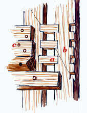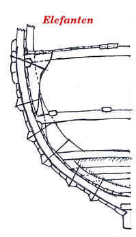 Hon kom att delta i strider 1563 0ch 1564. Under en reparation 1564 sjönk Elefanten nära Kalmar. Året därpå byggde man stenbryggor runt skeppet, att ha som underlag för gångspel som man med vilka man tänkte hissa upp skeppet. 1933-39 genomfördes en av de första vetenskapliga marinarkeologiska undersökningarna i vårt land av vraket. Delar av akterpartiet bärgades tillsamman med ett gångspel av capstan-typ och delar av en länspump. Nästan hela skeppet var byggt av ek. Av skriftliga källor att döma var skeppet av traditionell modell med såväl för som akterkastell. Då skeppet även kallades "Stora Kravelen Elefanten", förväxlas det ibland med Stora Kravelen. Som mest hade skeppet 75 kanoner (de flesta av liten kaliber). / 1564 blev ett ännu större skepp byggt: Mars (Makalös), som lär ha varit vitmålat, haft 107 kanoner (de allra flesta av liten kaliber)och varit på 700 läster (mot Elefantens 400)./ Bilden nedan visar en del av ett spant ungefär 9 meter från akterspegeln. Bordläggningen var fastsatt med trädymlingar, medan berghulten (femhörniga i genomskärning) var fastsatta med järnbultar. Bilden nedan visar hur spanten (b) hålls samman av klossar (a) som ligger rakt under bordläggningens (c) nåt. Dels underlättar dessa klossar vid drivningen, dels stöttar de långskepps (på senare tiders skepp satt spanten tätt intill varandra). Observera även spantens enkla laskar som endast hölls samman av att bordläggningens dymlingar gick in i spanten. Stor galleon 1585Nedan har jag avbildat en stor svensk galleon som jag gjort