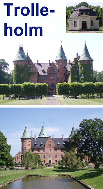 Trolleholm. Tre olika namn har detta slott burit: Under medeltiden: Kattisnabbe, på renässansen: Eriksholm och slutligen på 1700-talet: Trolleholm. 1538 övertog Tage Ottesen Thott marken och lät bygga en borg som bestod av fyra trevåningshus runt en fyrkantig gård med ett torn i varje hörn och med skyttegluggar i tornens takfot. Så det var en ganska stark borg. Efter det brändes slottet ner. Trots vissa ombyggnader på 1700-talet kom slottet att stå obebott ända till1886, då dess ägare Trolle-Bonde lät omskapa slottet totalt, till dess nuvarande utseende. Den danske arkitekten Ferdinand Meldahl stod här (som överallt annars) för ritningarna.. Idag används slottet av företag för internutbildning och liknande aktiviteter opch bara en liten del av parken är öppen för allmänheten. Det är lätt att hitta: Fortsätt vägen västerut från Eslöv.Efter en halvmil vänder du norrut och passerar Trollenäs och sen fortsätter du en halvmil. Lästips: T.ex. # Slott och herresäten i Sverige. Skåne 1 av Sven T. Kjellberg. # Ragnar Lönnäng: Till skånska slott och sevärdheter. Länkar: |