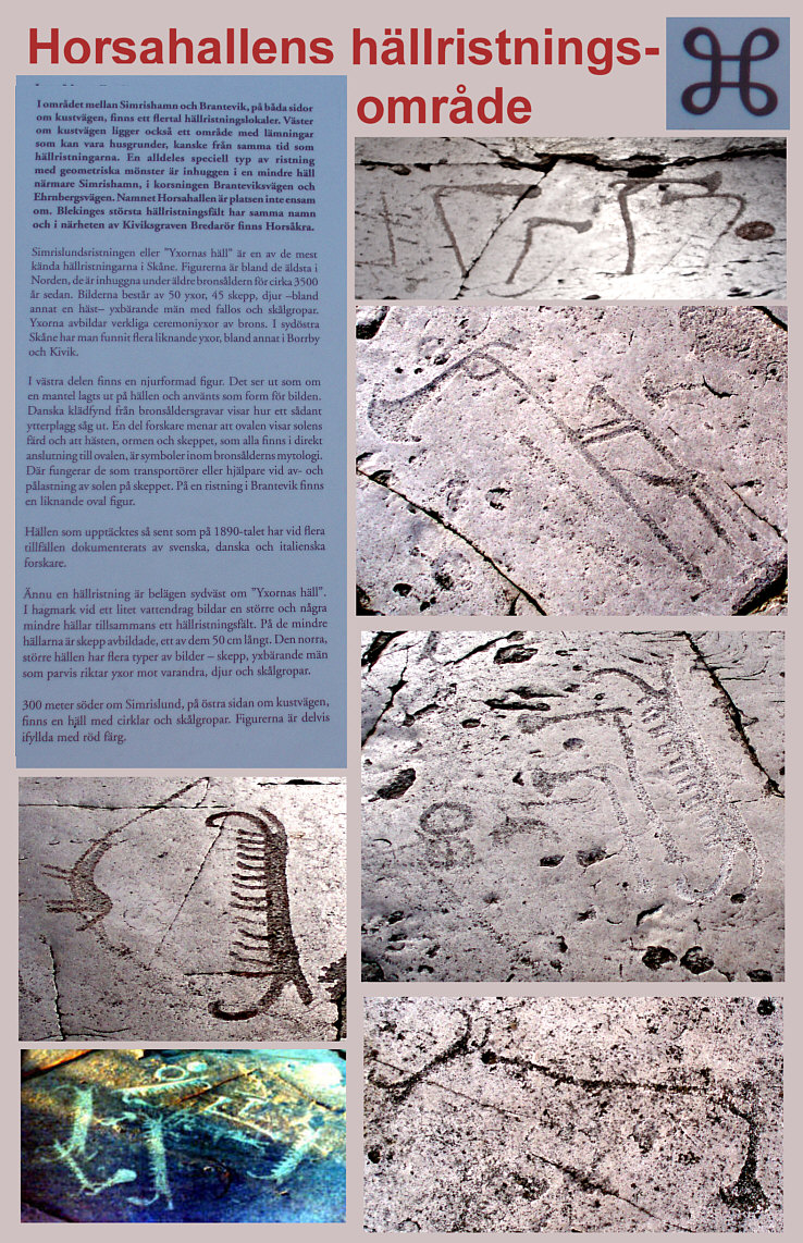 Horsahallens hällristningsområde är ett av flera områden med hällristningar nära Simrishamn. Det här ligger vid infarten från Brantevik. Bilden i nedre vänstra hörnet plåtade jag för många år sedan i kvällsljus. Det är i sådant släpljus som bilderna syns bäst. De övriga bilderna är fotograferade under sämre ljusförhållanden. Informationsskylten på platsen (ovan), ger bra information. Hällristmingarna är ungefär samtida med Kungagraven i Kivik.